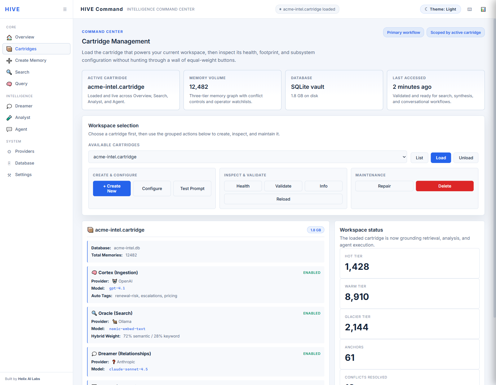H.I.V.E. turns documents, conversations, logs, and scenarios into analyzable memory. Run it 100% local with Ollama or mix in OpenAI, Anthropic, Google, Azure, and Grok. Cartridge isolation, tiered storage, deterministic recall, and conflict resolution keep context useful without giving up control.